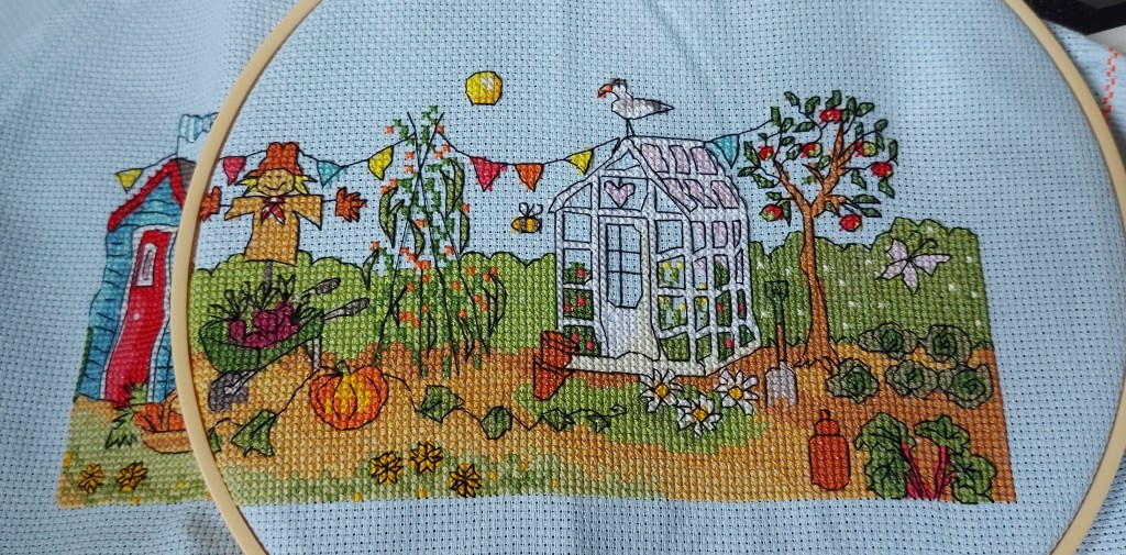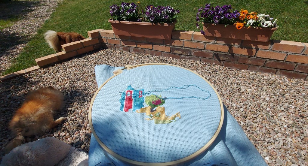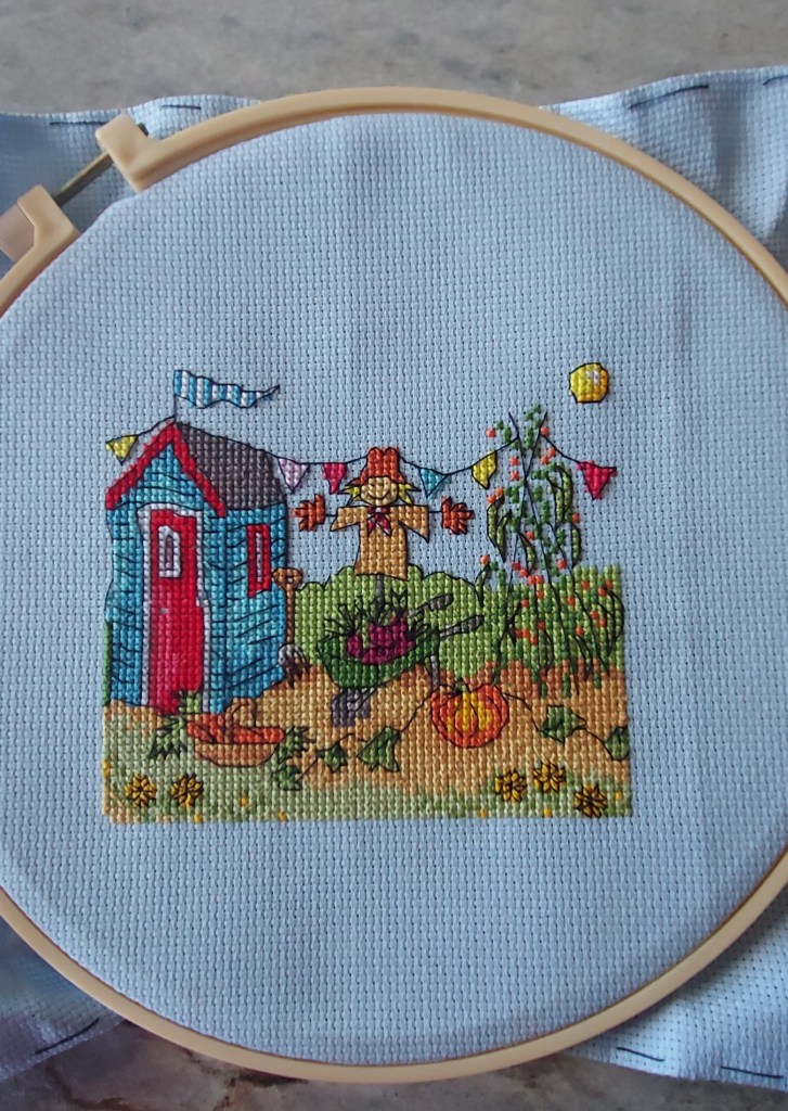 To combat stress, I have been spending random moments doing some more cross-stitching, have taken up knitting (for the first time in decades), and piano-playing (badly!). Being creative really helps me to keep my cool and so output of arts and crafts has been abundant! I started cross-stitching a massive picture last August, and then left it for a few months while I took up knitting again (my daughter was learning to crochet, and this reminded me of how much I used to like knitting the kids their jumpers when they were babies). Progress on this massive picture is VERY slow – who knows when it will get finished. Because it is so large, it is getting in the way at the moment especially with rooms having to be emptied for the electricians and, shortly, the heating rehaul. But, I am enjoying doing it whenever I have a spare hour or so.